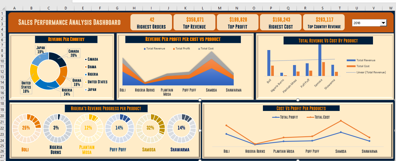 This is an excel dashbord showing the financial report of Adebriel food INC
